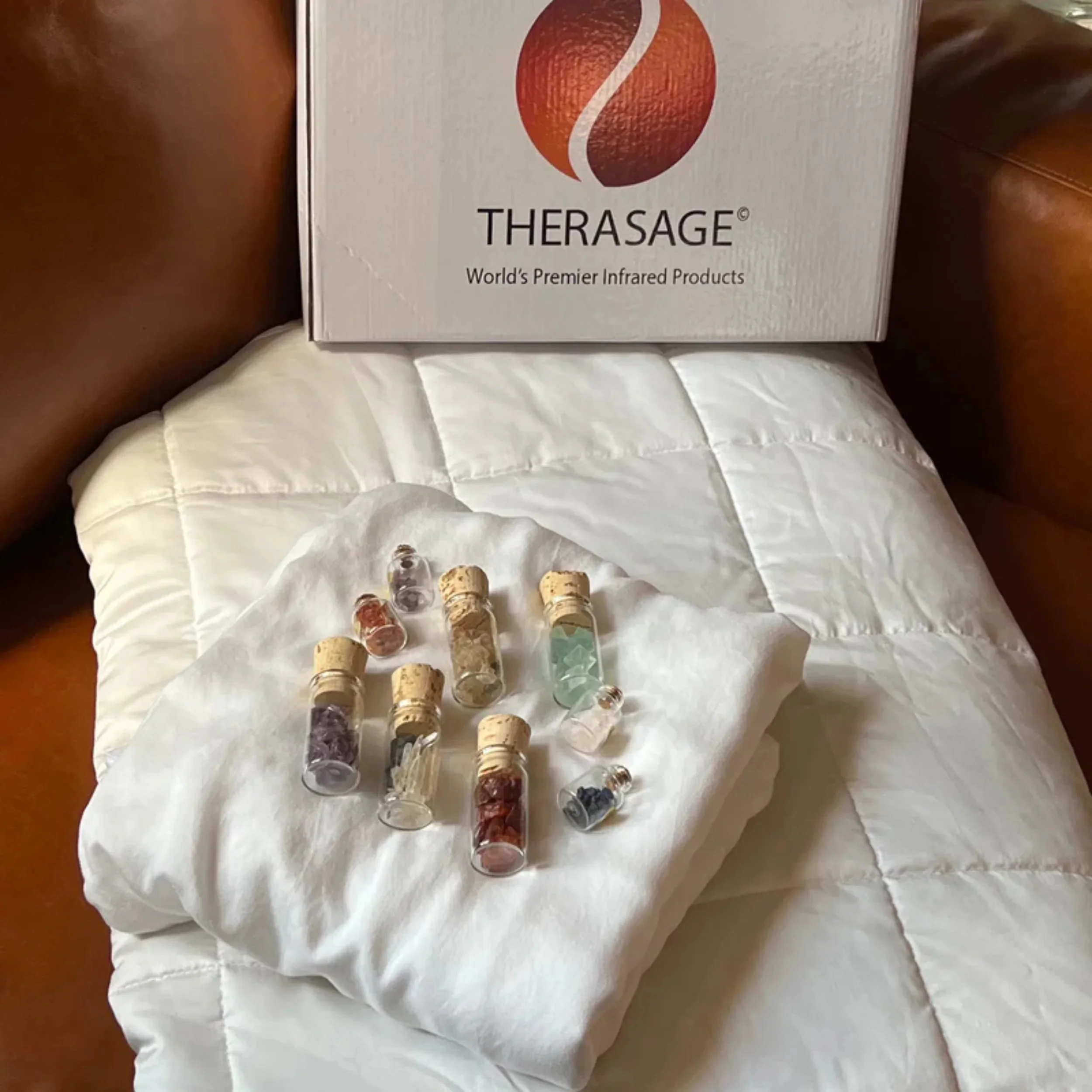 The ultimate weighted blanket and weighted eye pillow system, crafted with advanced gemstone technology and luxurious 600 thread count bamboo fabric.